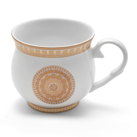 Дизайн кружки выполнен в белом цвете, что делает ее визуально легкой и воздушной. Золотистые, пышные витки, изображенные на ободке, создают уникальный орнамент "бараньего рога", который является оберегом и символом защиты.