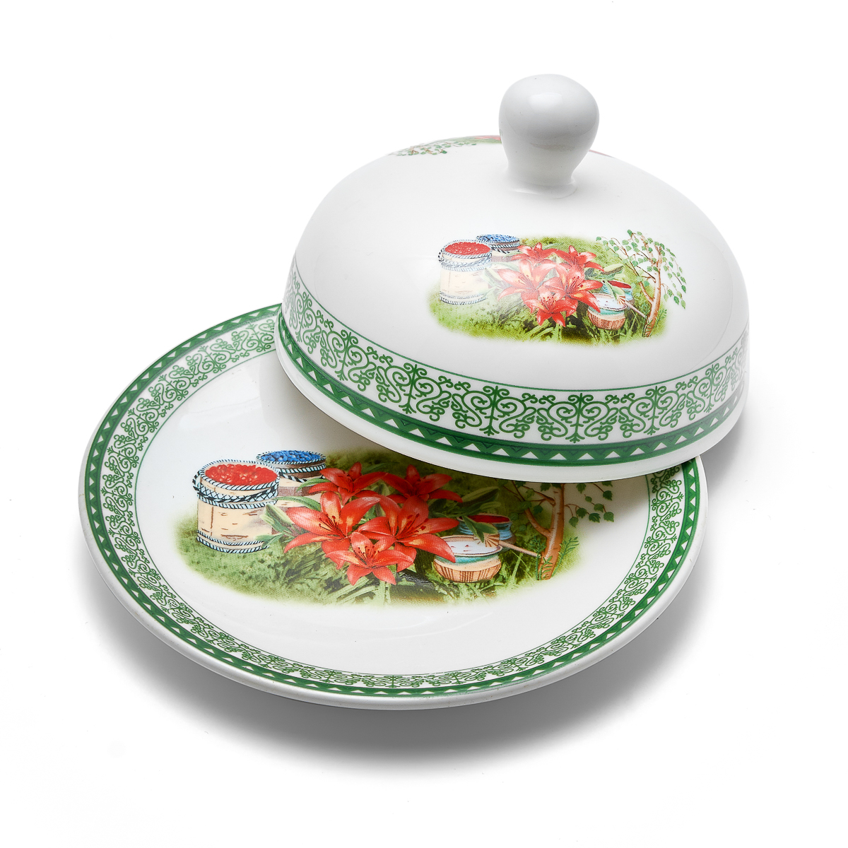 Маслёнка оснащена фарфоровой крышкой, которая надёжно закрывается, предотвращая попадание воздуха и сохраняя свежесть продуктов.