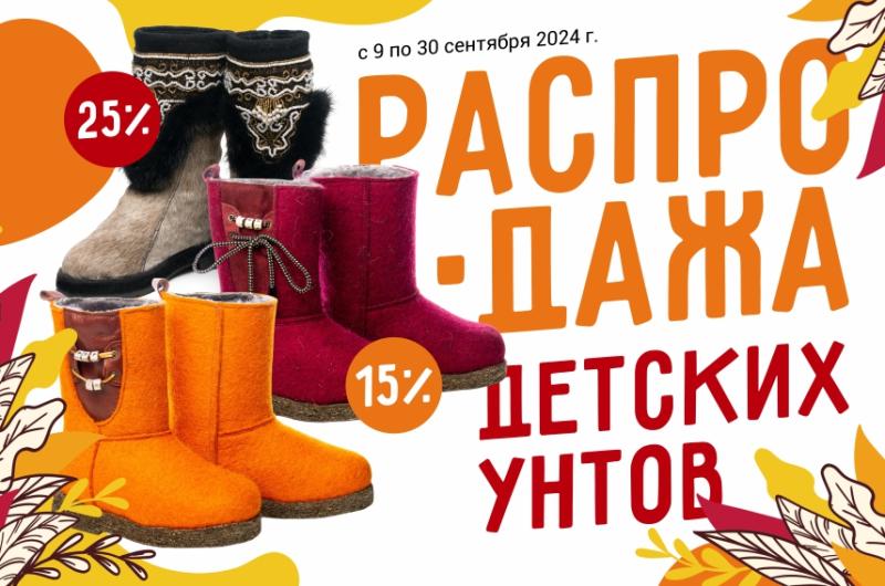 Только в сентябре, последний этап распродажи детских унтов, перед наступлением холодов. В акции участвуют торбаса детские, скидка – 15% и унты из конского камуса для девочек, скидка до -25%. Распродажа продлится с 9 сентября по 30 сентября 2024 года.