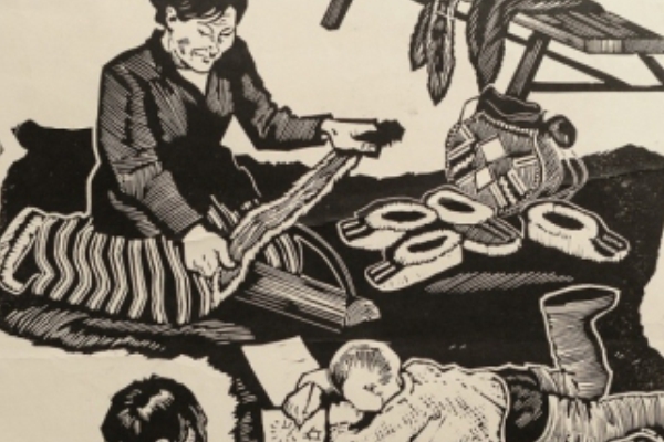 Бухаров Анатолий Павлович “За работой” оленеводов занимает выделка и обработка оленьих шкур. Женщина на линогравюре занимается обработкой камуса для изготовления меховой обуви и сумок-патку.