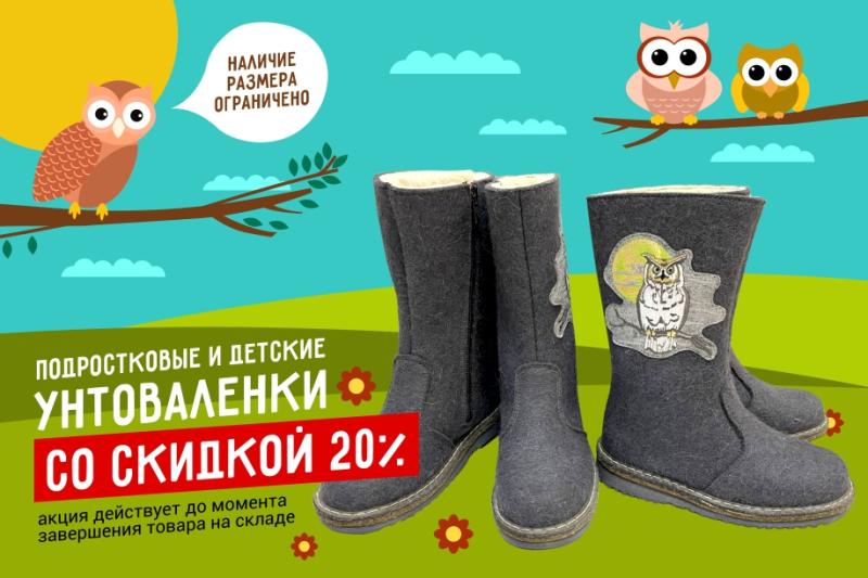 Осталось мало размеров – успевайте! Подростковые и детские унтоваленки со скидкой -20%, акция действует до момента завершения товара на складе.