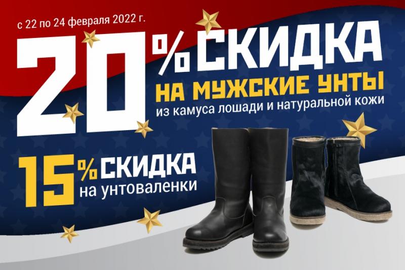 Только с 22 по 24 февраля 2022 г., мы запускаем скидку 20%* на мужские модели унтов из камуса лошади и натуральной кожи! На унтоваленки действует скидка 15%.