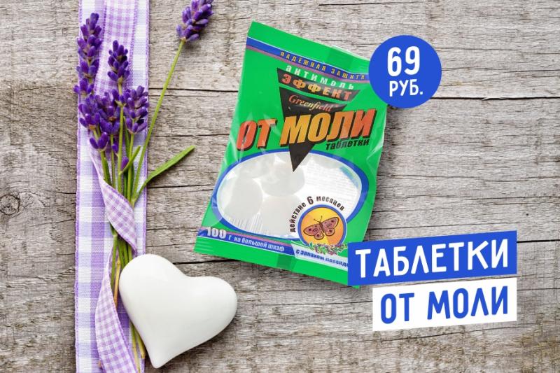 В нашем отделе вы найдете простое в использовании и надежное в эксплуатации: Таблетки от моли. В упаковке 6 таблеток, стоимостью 69 руб. за упаковку.