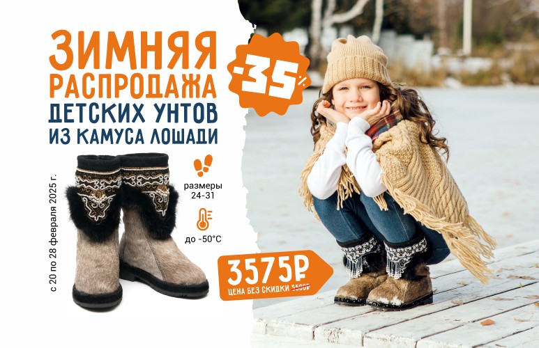 Зимняя распродажа детских унтов для девочки. Акция действует с 20 по 28 февраля 2025 г., скидка -25%.